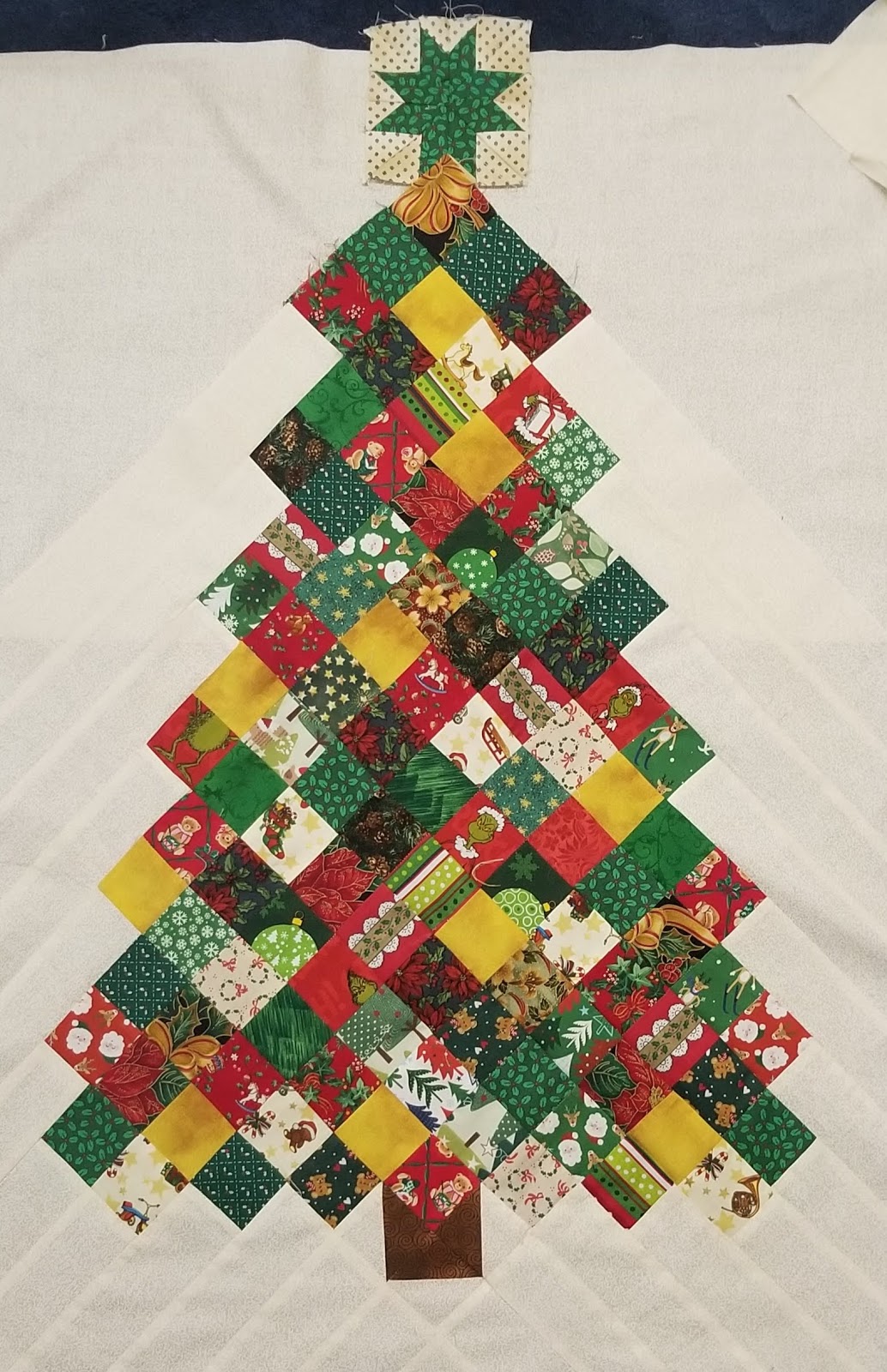 I'm still wanting to make some more of those little sewing carry-all bags but today I made some progress on my Christmas Tree Wall hanging........the flimsy is done! But before I got there I was at this place...I had used strips of white on white to fill in the sides of the mini charms and I really wanted to be lazy and just fill in these last two triangle areas with 2 triangular pieces of white on white....